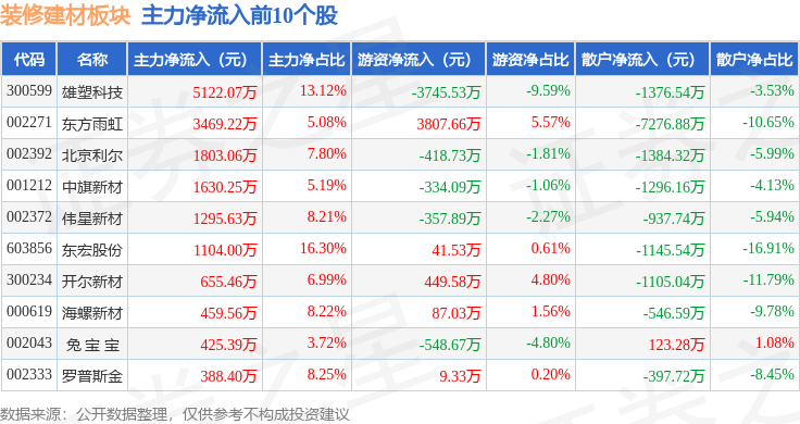 不形成投资。雄塑科技领涨。当日拆建筑材板块从力资金净流出29.91万元,拆建筑材板块个股资金流向见下表:证券之星动静?由AI算法生成(网信算备240019号)?